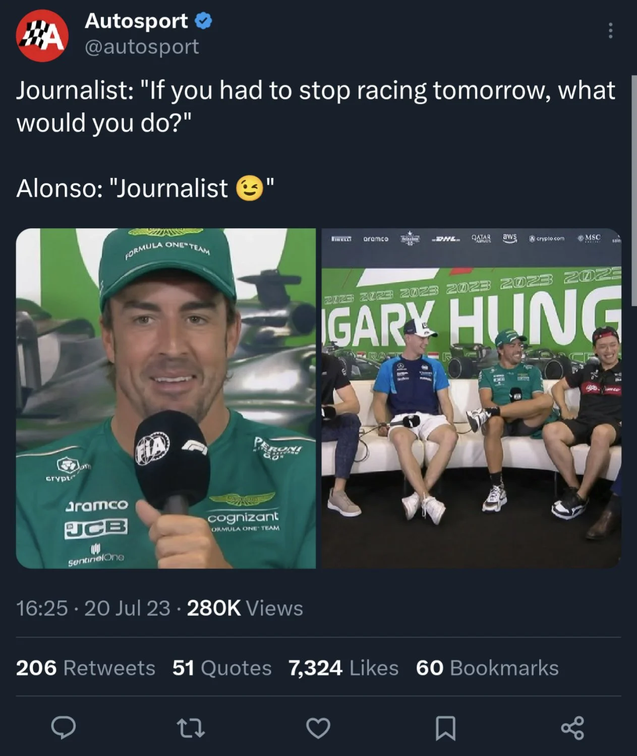 Formula 1 @lemmy.world bwoah @lemmy.world 2y ago Autosport Journalist: "If you had to stop racing tomorrow, what would you do?" Alonso: "Journalist"