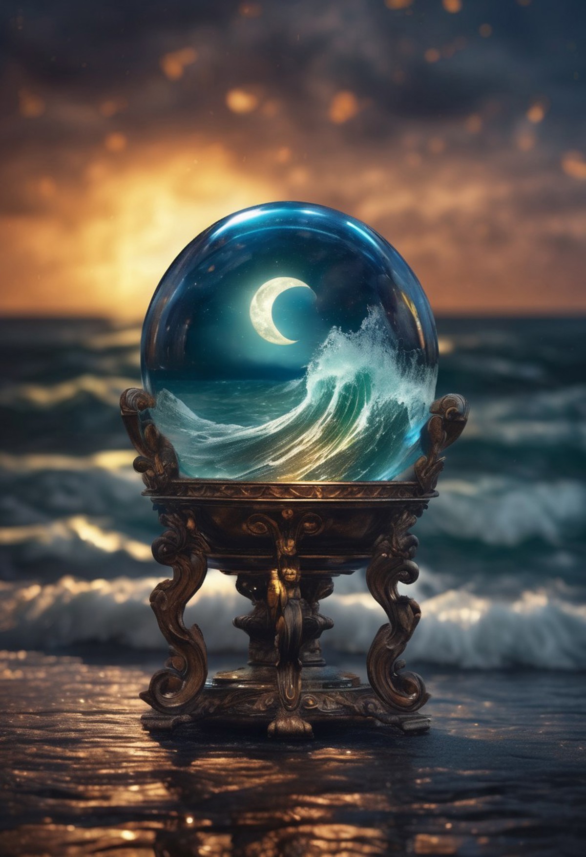 Image description: An ornate glass sphere with a cresting wave and crescent moon within it. The sphere is perched atop an intricately designed stand with baroque-style curves and details, set against a backdrop of an actual ocean under a twilight sky,
