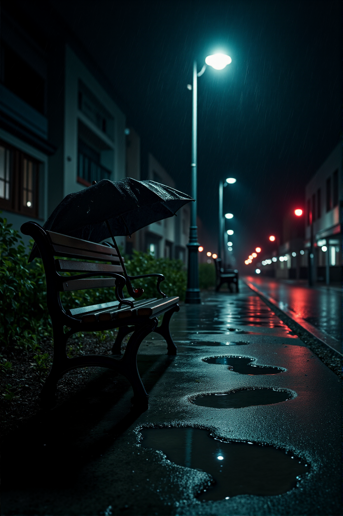 Under a dim streetlamp, an umbrella leans against a rain-slicked bench. The storm has passed, leaving only puddles reflecting neon city lights. Footsteps leading away from the scene disappear into the night, as if someone walked away without looking back.