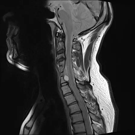 Congenital Dermoid Tumour On Spinal Cord. Fused Vertebrae From C4-C7 (MRI)