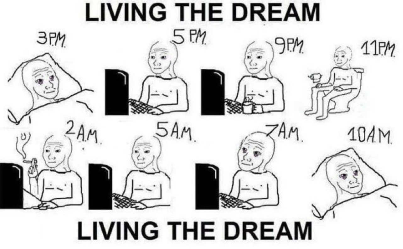 i dont actually go to bed at 10 am but this ritardo who made this meme, im worried about them lowk.. anyway you guys, tomorrow im FINALLY getting unbanned from reddit and hopefully that will be my fisrt and last ban!!! this site sucks so i probably wont be coming back but who knows. reddit also sucks but i am emotionally attachd to some subreddits so... ya know the feeling. alright folks, its 10 pm on a saturday and im drunk typing this. have fun everyone