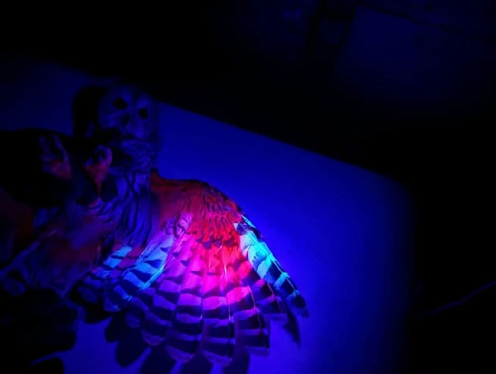 Porphyrin pigment reflects the UV light as a pink/purple colour, but it fades in sunlight, so older feathers show up darker with age. You can see this owl has replaced several primary and secondary feathers on her wings, front and legs this year.