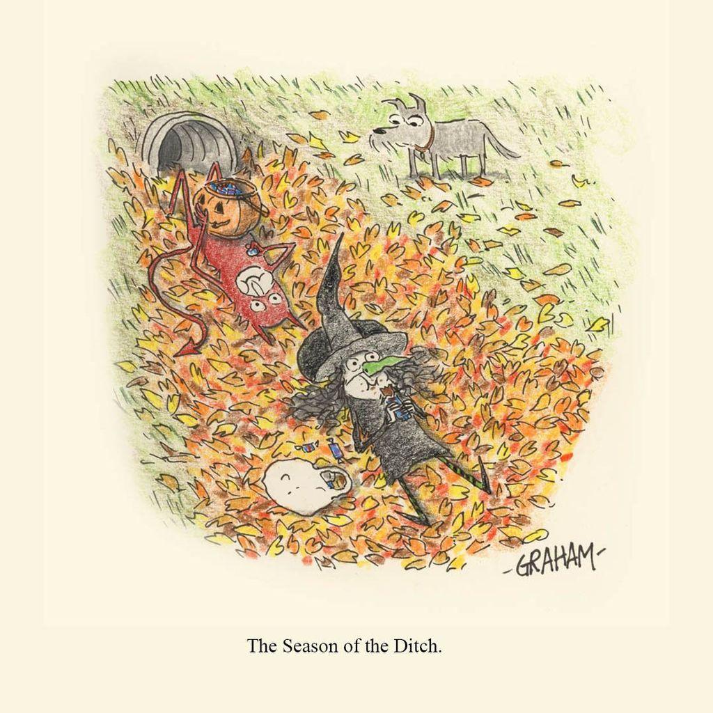 SourceAlt Text: A cartoon illustration of a two kids dressed as a witch and a devil laying in a ditch of colored leaves eating candy as a dog watches. Caption reads "The Season of the Ditch."