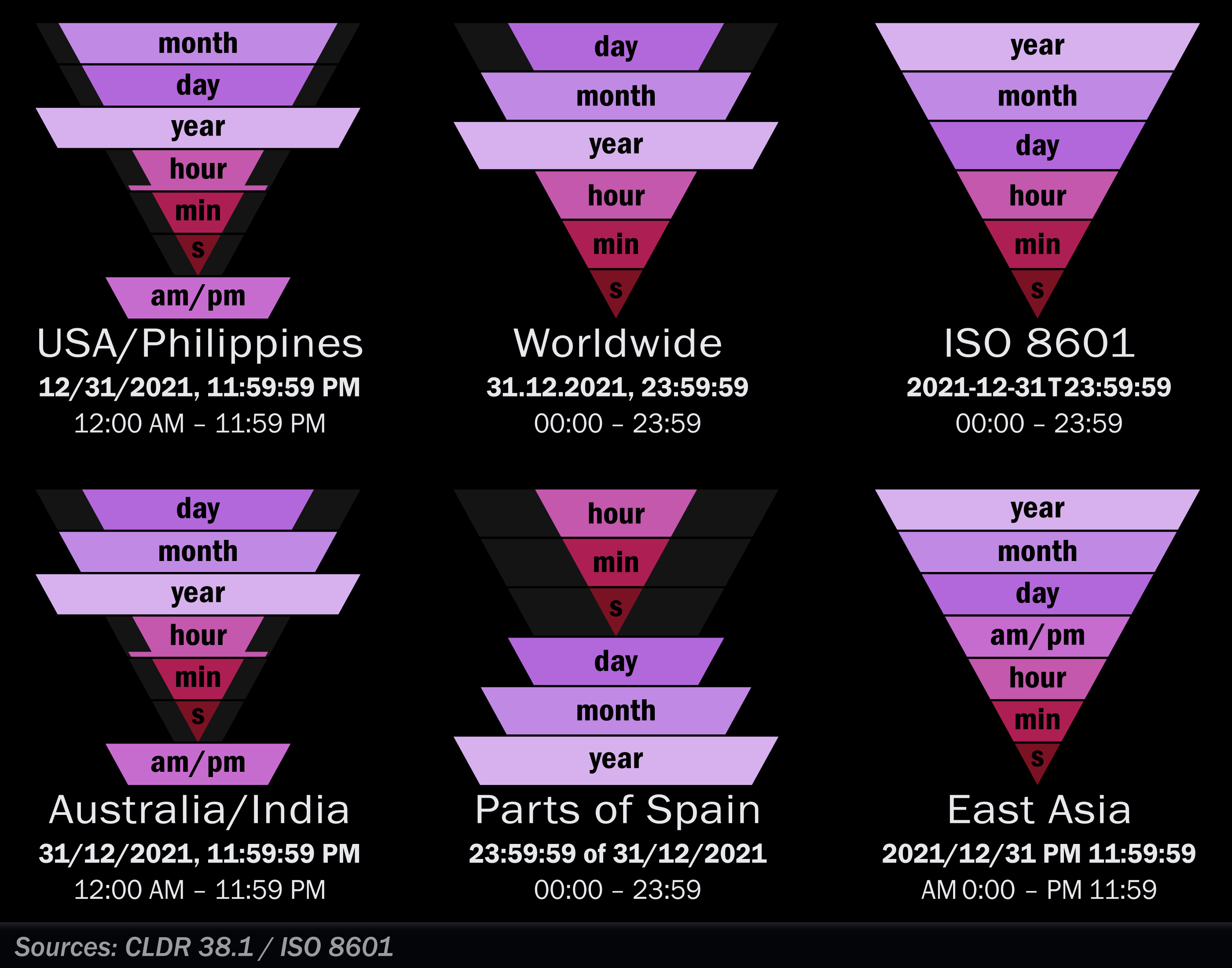 Some years ago in a chain of discussion the more typical simple pyramid representation of date formats was improved to incorporate every (big and) little detail of the various formats accurately.