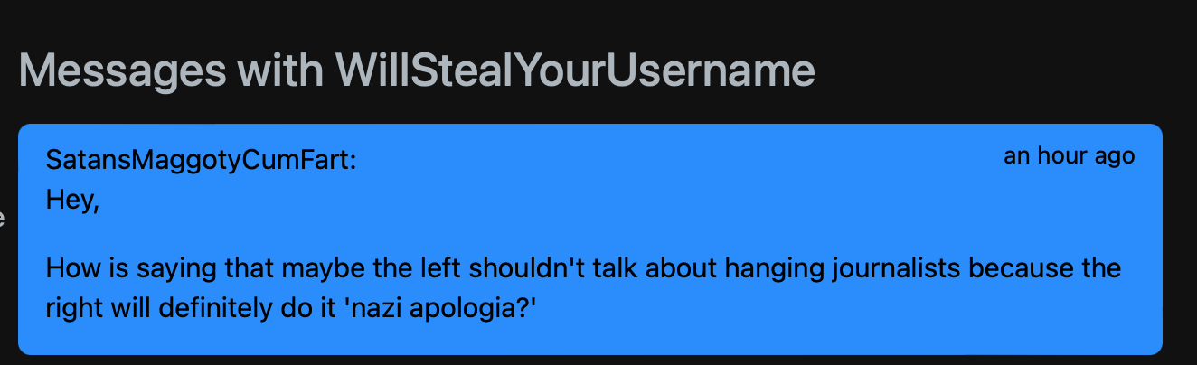 Ye Power Trippin' Bastards @lemmy.dbzer0.com SatansMaggotyCumFart @piefed.world 2d ago Defending journalists from being hung is 'Nazi apologia' to WillStealYourUsername
