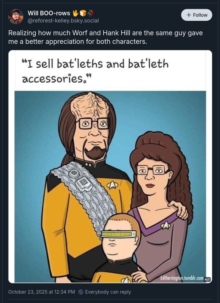 TenForward: Where Every Vulcan Knows Your Name @lemmy.world negativenull @piefed.world 2d ago I don't have an anger problem, I have an honor problem ALT https://bsky.app/profile/reforest-kelley.bsky.social/post/3m3uyrkymqc2y