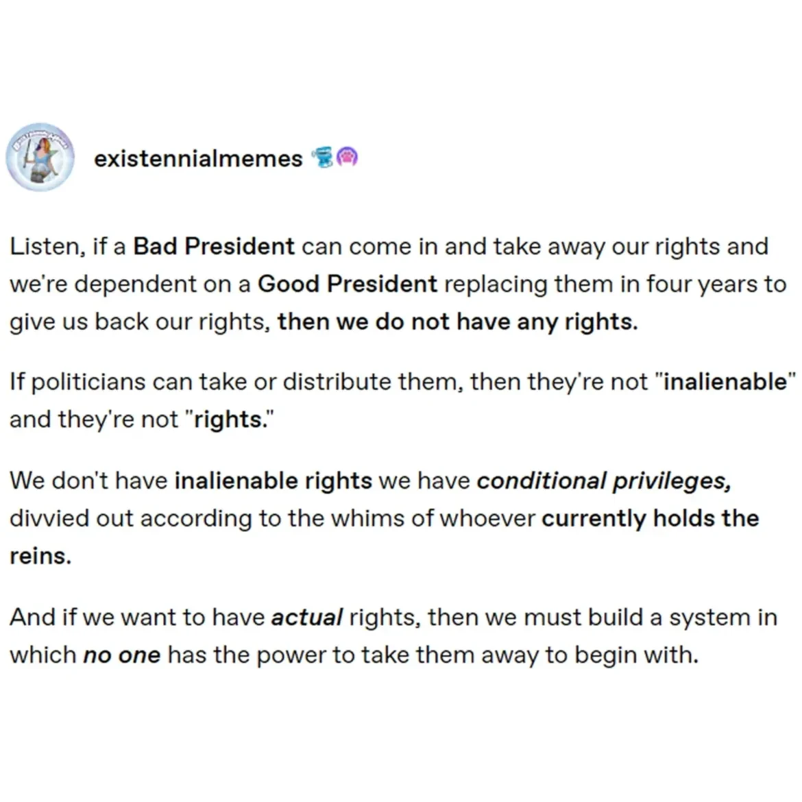 What if a bad supreme court can come in and take away rights? If that's the case, then it doesn't matter if it's explicitly listed in some kind of constitutional document because the bad court can choose to interpret that document in such a way that the right disappears. By this definition, there's no such thing as a right, because there's always someone who can come in and take it away. There aren't, and can not be, any actual rights, just conditional privileges.