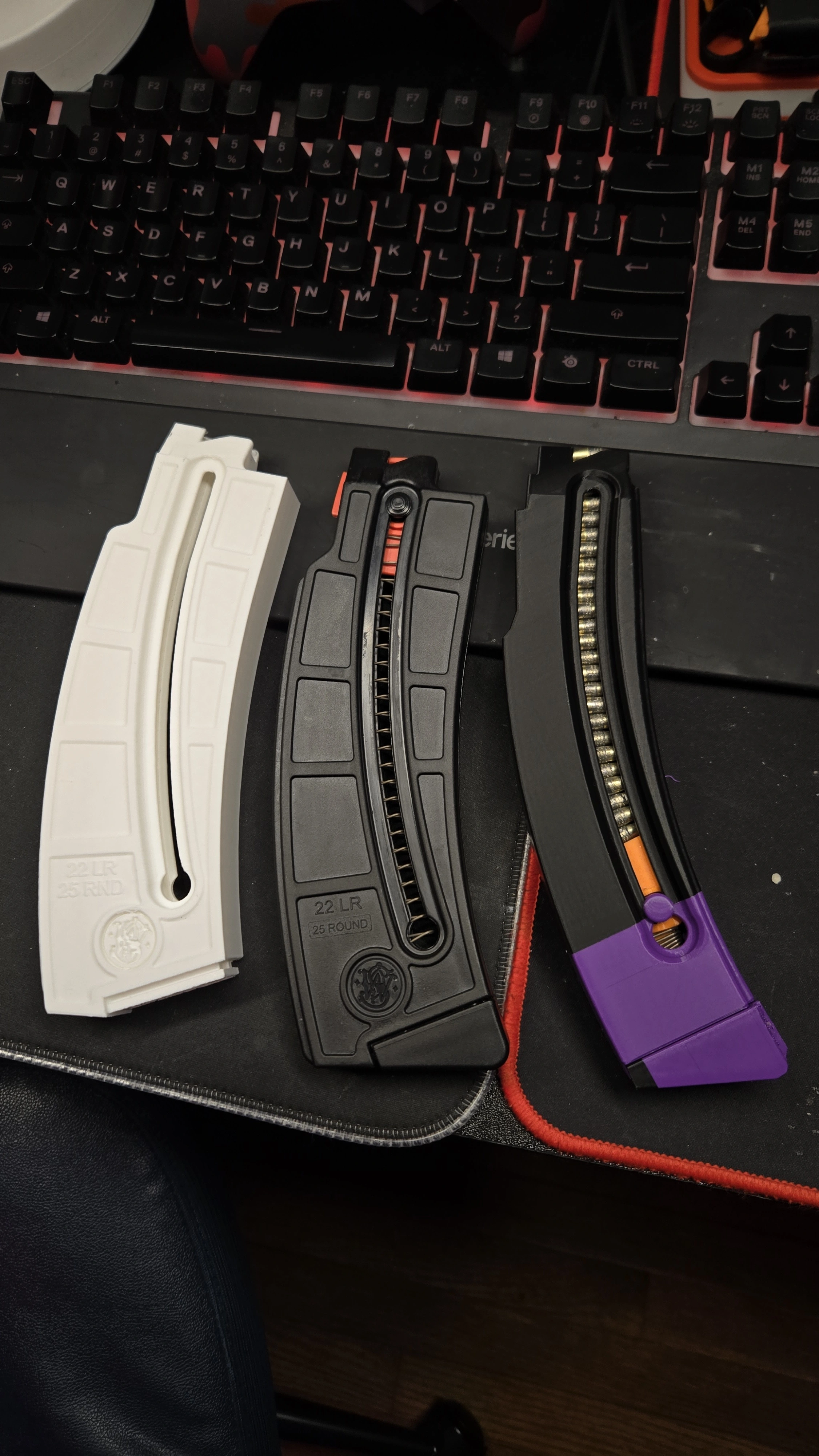 Current deAR22 magazines available have not performed well for me, so I am hoping to create the best functioning mags for the deAR22. This new design utilizes the the same track, followers, and springs as the printed 15-22 magazines I just released. Easy to load and no hang ups and/or binding. 25 rounds only for now. First print provides proof of concept. Just needs some tweaks for snug fitment in the magwell. Also, LRBHO functionality included in these!