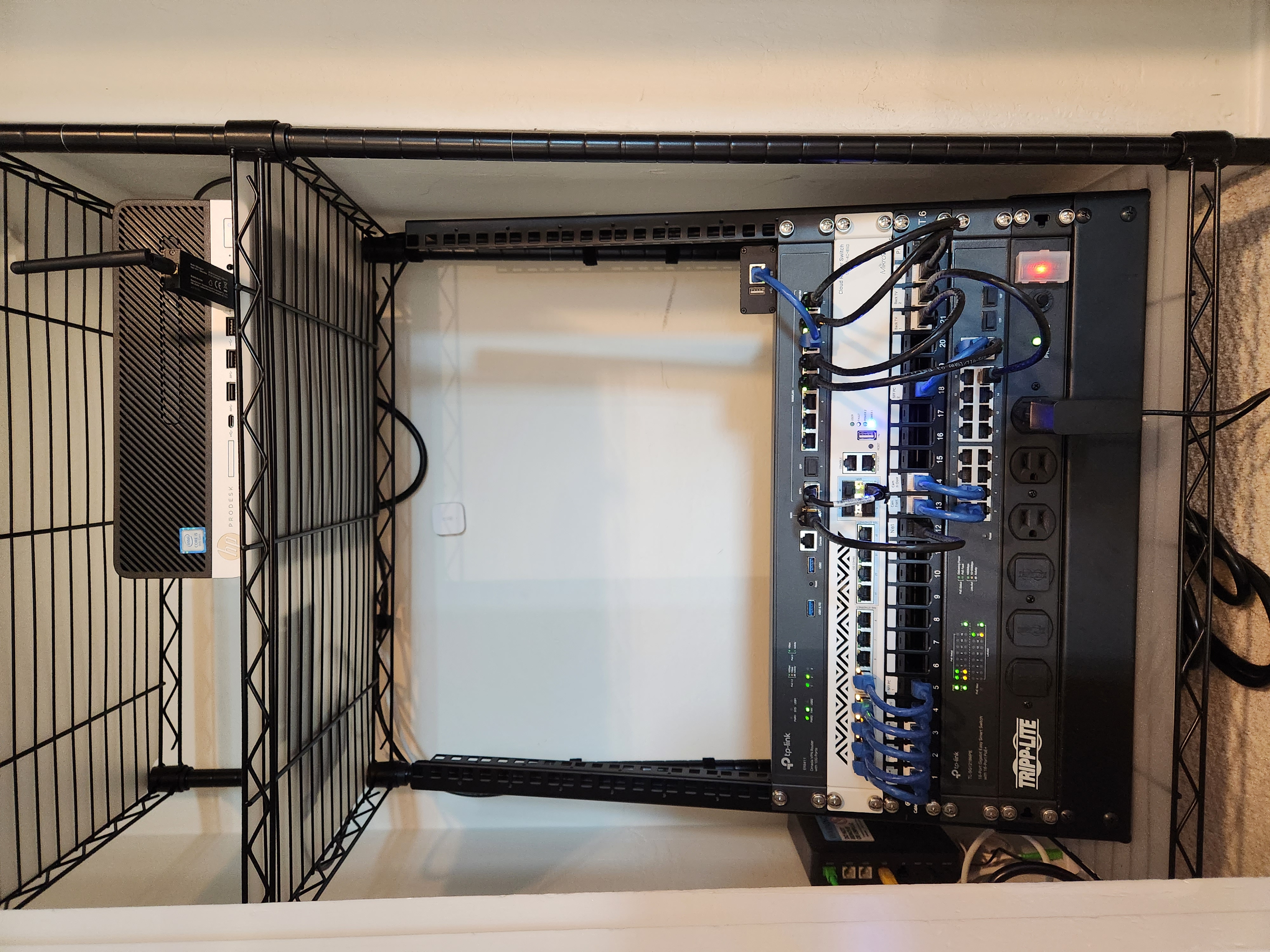 - (not pictured) Wireless access point is just a basic Netgear one I bought from Costco a few years ago. It's sitting on the top shelf. I'm going to replace it with a TP-Link Omada ceiling-mounted one once their wifi 7 access points have been released.