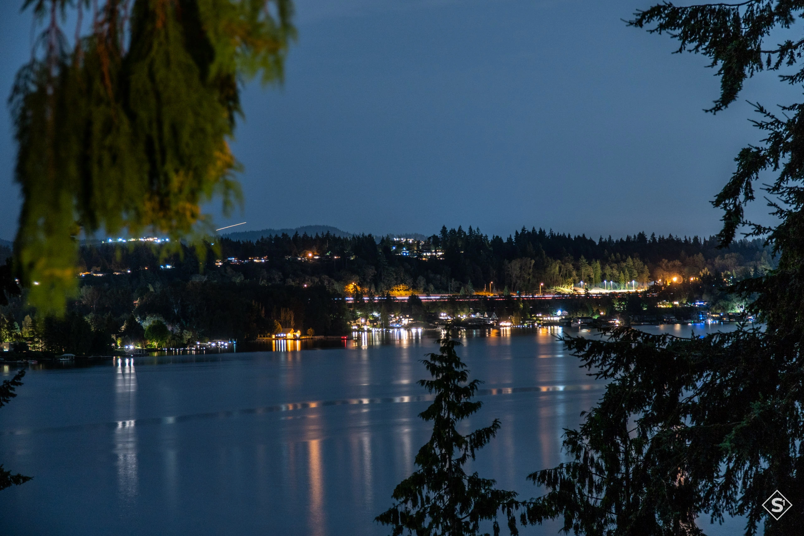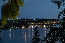 The heatwave from earlier has calmed to a warm summer night. The water on the lake is still and you stand in the dark looking at the lights across the bay. The evening lingers for a moment.