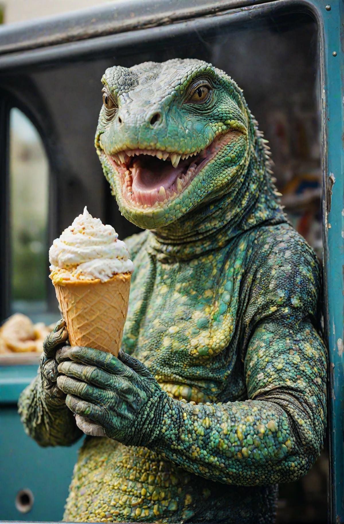 Image Caption: A photo-realistic image of a green lizard-like creature holding a large ice cream cone. The creature has a large head with a wide mouth and sharp teeth. Its body is covered in green scales, and it has two arms with hands. The ice cream cone is a waffle cone with a large scoop of vanilla ice cream on top. The creature is standing in front of a blue truck with a window. The background is blurred and appears to be a city street.
