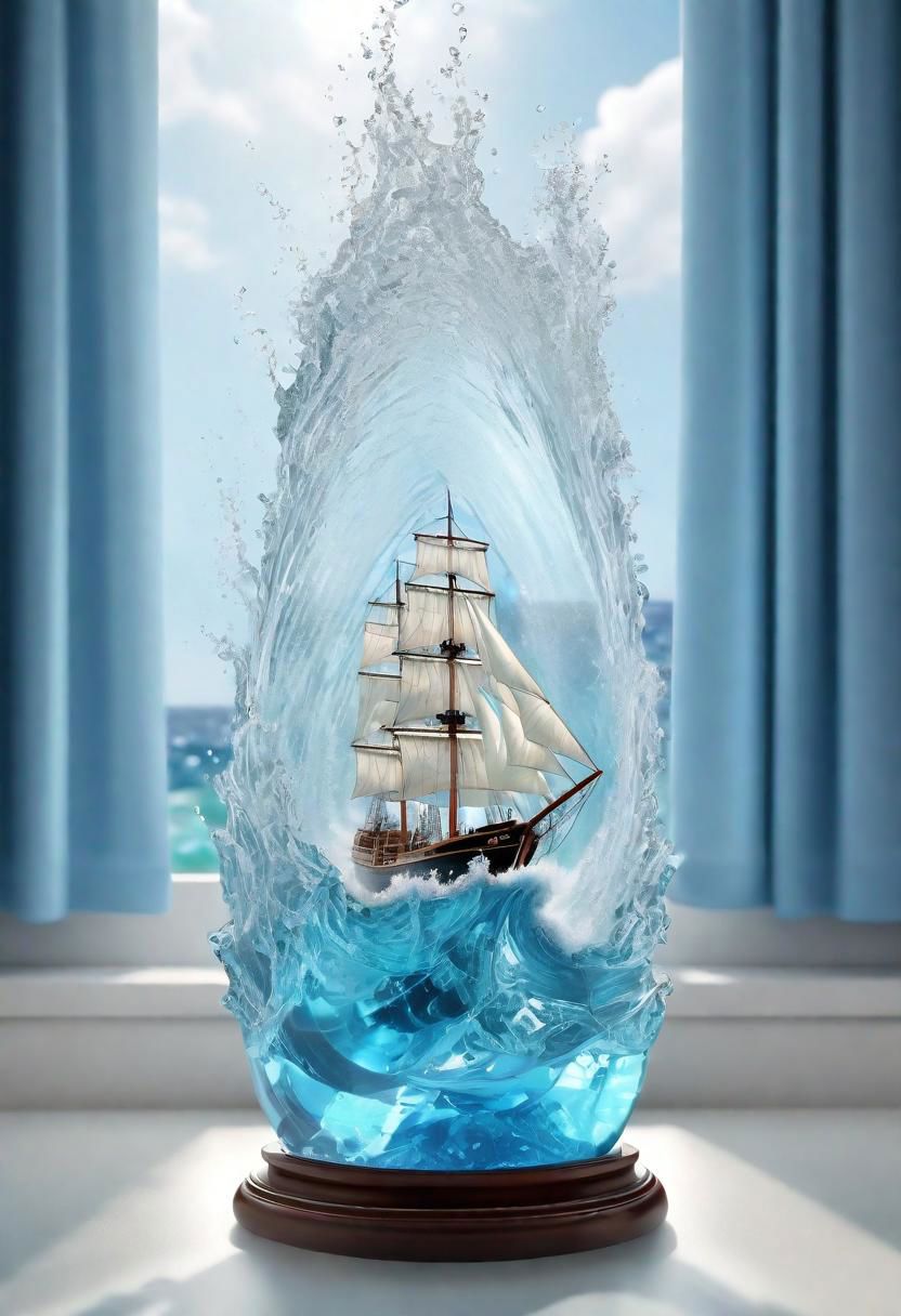 Image description: A ship model encapsulated within a crystal shaped like a dynamic splash of water, creating the illusion of a ship navigating through rough seas. The ship model is detailed, showcasing three masts adorned with white sails, brown hull, and intricate rigging. The water splash is animated and lively, with droplets suspended midair and waves crashing around the ship. The scene is set on a window sill; two blue curtains flank either side of the image. Outside the window, a serene ocean under a partly cloudy sky contrasts the tumultuous waters encasing the ship model.