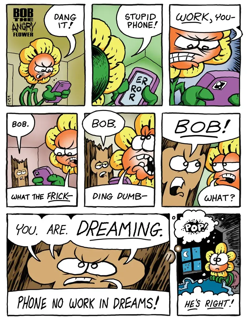 Comic Strips @lemmy.world Sundray @lemmus.org 2y ago Phone no work Bob the Angry Flower for 13 January, 2023.