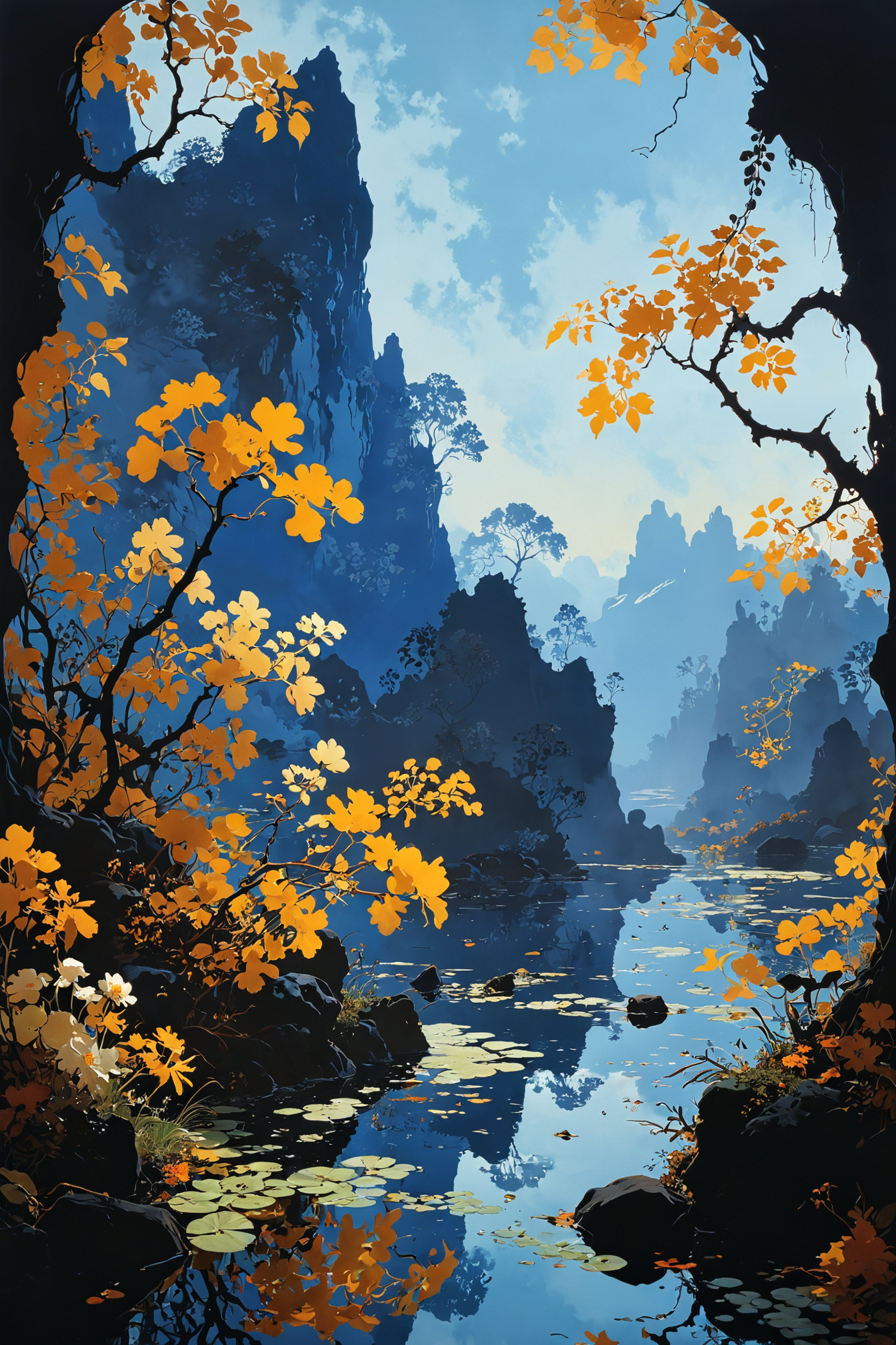 Image description: A serene and mystical scene of nature where towering dark rocky formations are silhouetted against a deep blue sky. Bright golden leaves, reminiscent of autumn, adorn the trees that cling to the rocks. The contrast between the dark shadows and vibrant foliage creates a sense of depth and tranquility. There is an ethereal quality to the scene, evoking feelings of solitude and introspection.