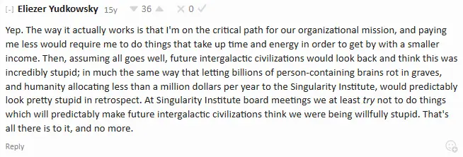 Still, it merits pointing out that this explicitly isn't happening because the private sector is clamoring to get some of that EY expertise on nothing the moment he's available, but because MIRI is for all intents and purposes a gravy train for a small set of mutual acquaintances who occasionally have a board meeting to decide how much they'll get paid that year.
