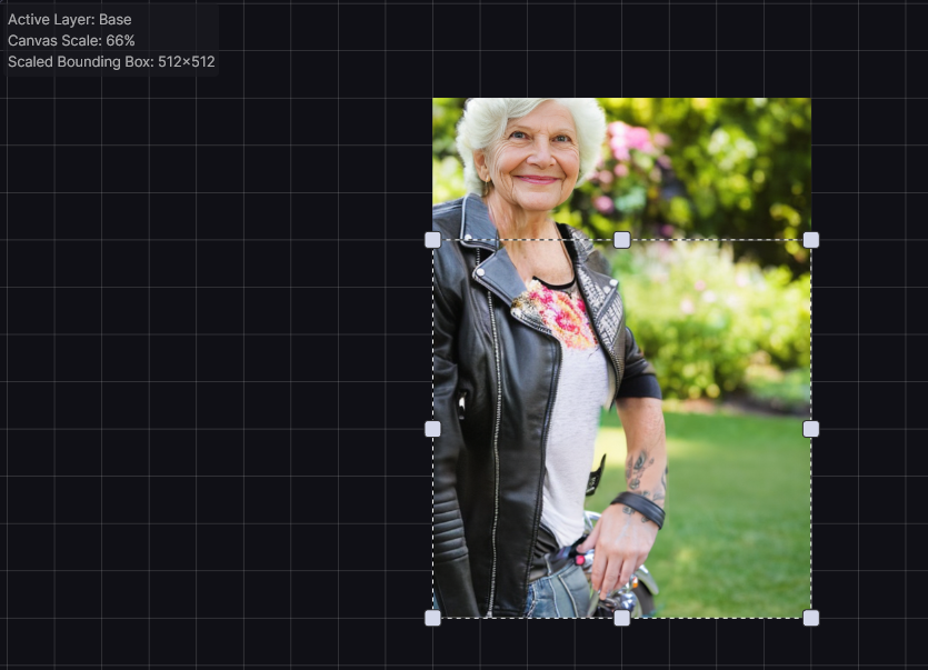 "Outpainting" means asking the AI to expand the original image beyond its original borders, making a bigger image that's still based on the original. For example, extending the above image of your Grandmother in a biker's jacket to include her wearing jeans (and while we're at it, a motorcycle!)