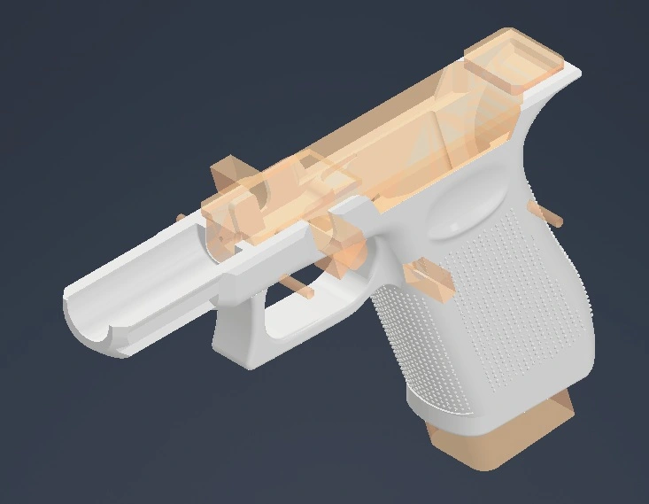 I wanted a gen 5 model to start with so that I could fill in most of the internals and then use the G100 boolean negative to subtract away what I need to make it compatible with the G100 fire control unit. All that its really going to do is make it look like a gen 5 glock externally and also gen 5 mag release. I guess its not that important because I've already found a 19x file that was gen 3 compatible and modified it to accept the g100 chassis. I was just hoping that there was a gen 5 replica model somewhere to start with so I could make one more true to an actual gen 5 frame. I haven't tried printing yet but I modified this model the past couple days. The biggest hiccup was recontouring the back strap because the G100 chassis is really deep in the trigger housing area because it holds the trigger housing and then also has more material under it for a mounting pin. This makes it dangerously thin in the backstrap around where the pin is. So I added about 1mm more material to the backstrap while trying to maintain the same hump and contour.